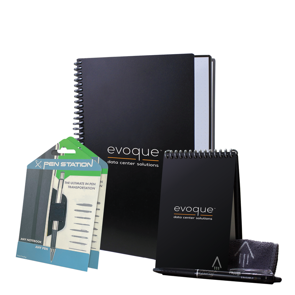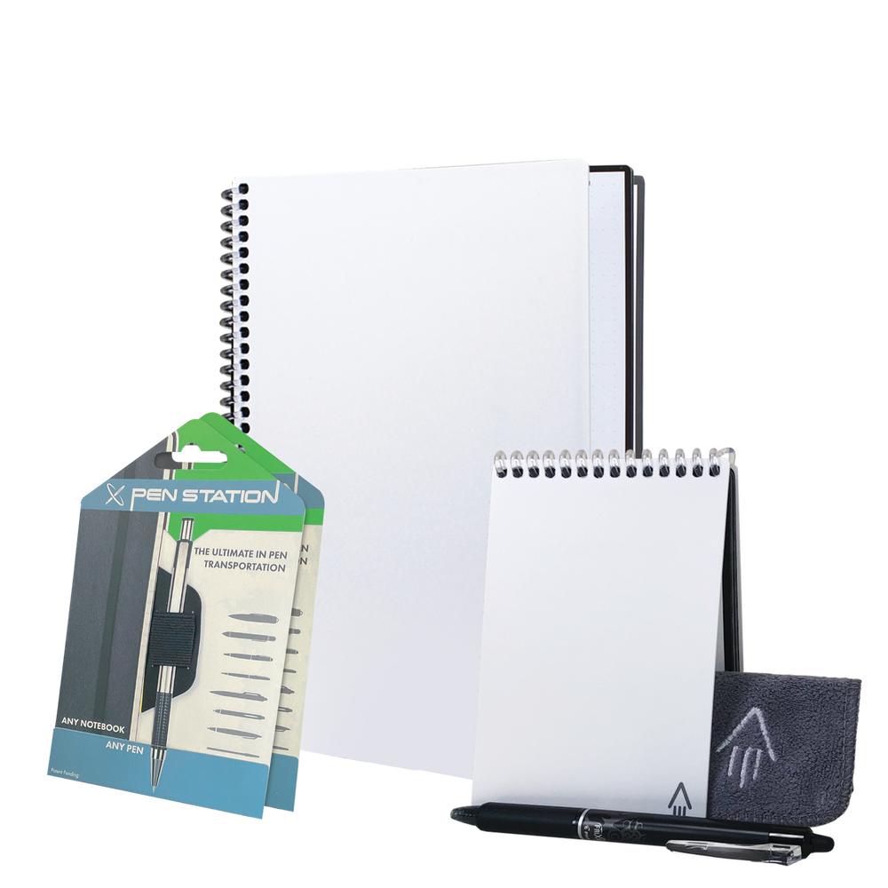 Launch your Rocketbook journey with our Starter Bundle! Write ideas, notes, plans, and more in our best-selling Core notebook or take your Mini for on-the-go writing anywhere. Scan with the free app and then use the included microfiber towel, some water, and watch your notes erase like magic. The included pen stations ensure that you will never lose your Pilot FriXion pens. Brand both the Core and the Mini to create the ultimate Holiday gift for your employees, clients, giveaways, and more!