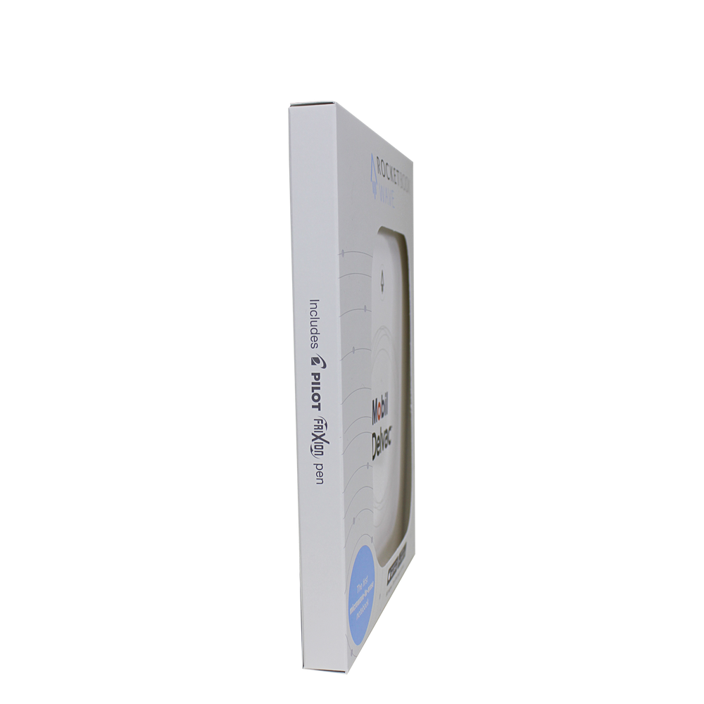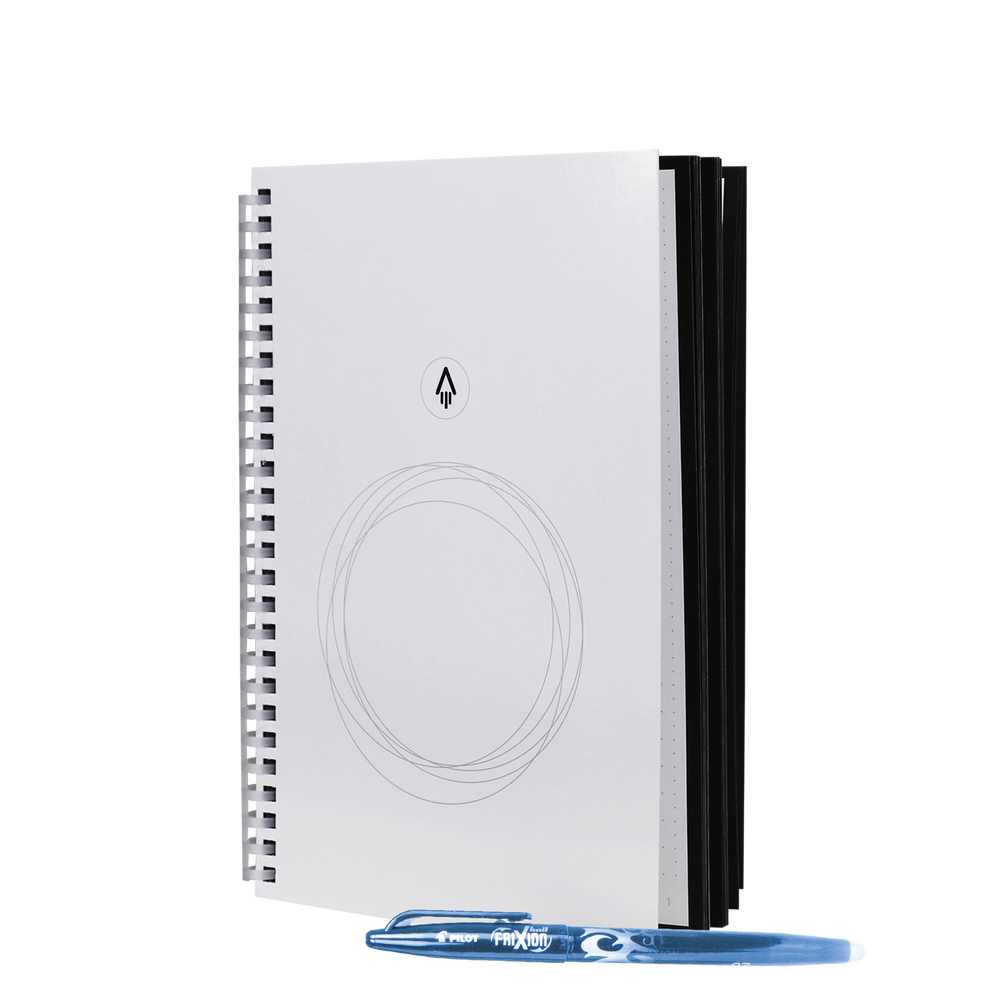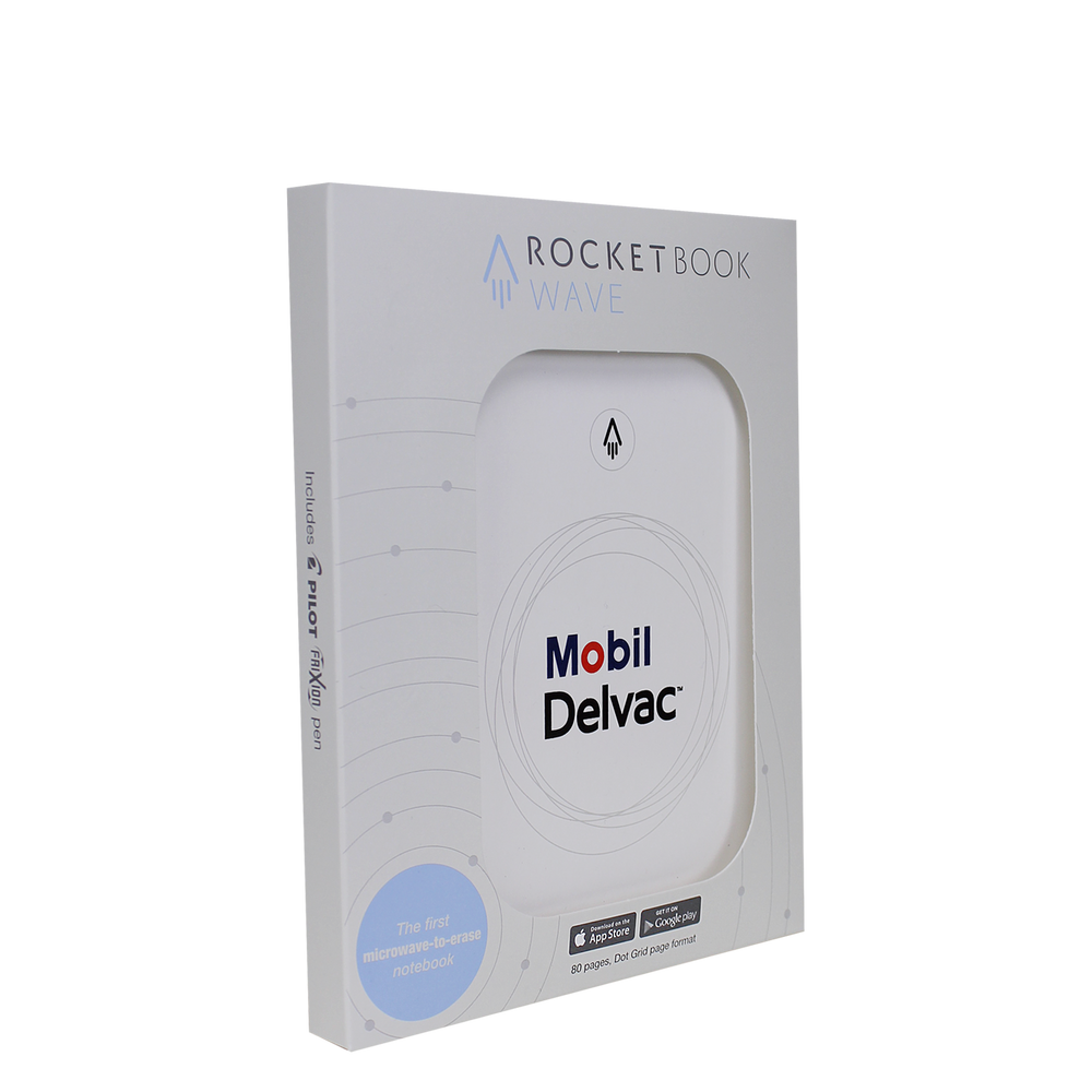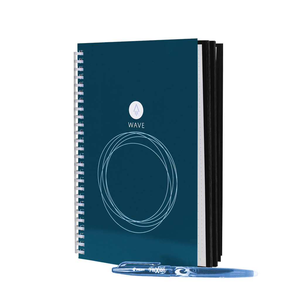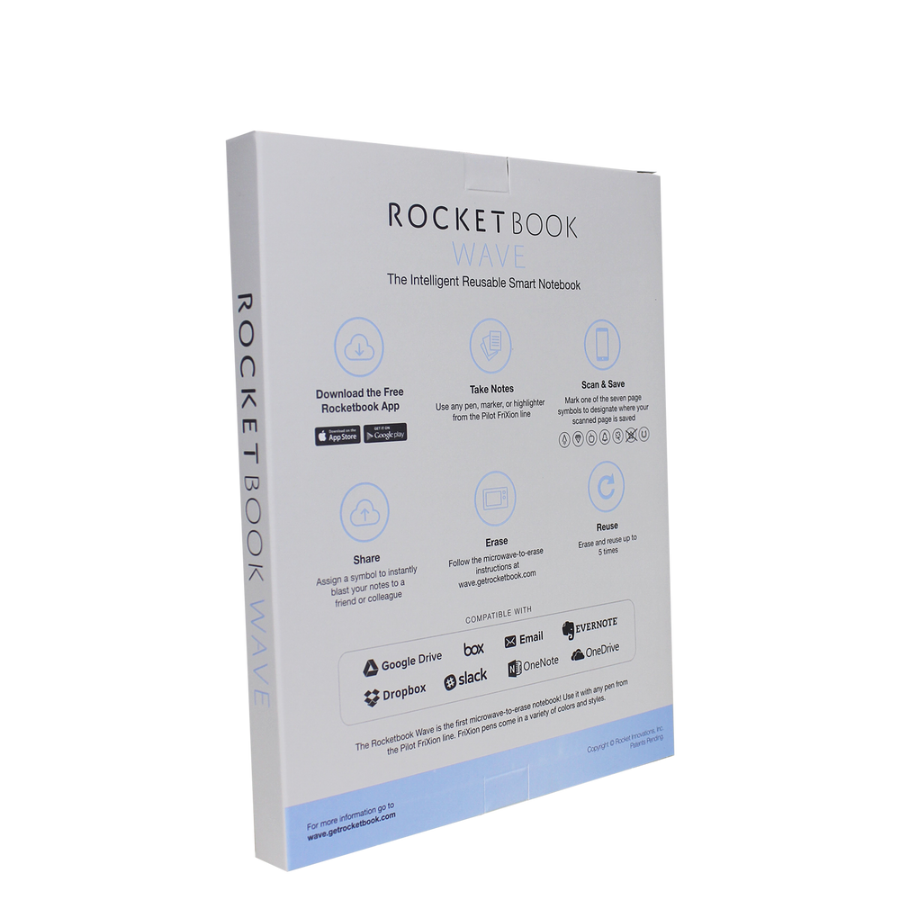 The Rocketbook Wave provides the freedom of a traditional pen and paper notebook, while instantly blasting your notes into the cloud using your smartphone. When you use Pilot FriXion pens with the Rocketbook Wave notebook, you can erase your notes using your microwave oven and reuse your notebook. Each of these custom branded Rocketbook Waves come packages with the Rocketbook and 1 FriXion pen.